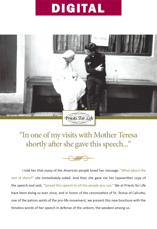 Mother Teresa gave this speech at the National Prayer Breakfast in Washington, DC on February 3, 1994. She personally asked Fr. Frank and Priests for Life to spread her speech to everyone. Order your copy below OR Click here to receive a PDF version of this brochure Click here to read more about Priests for Life and Mother Teresa